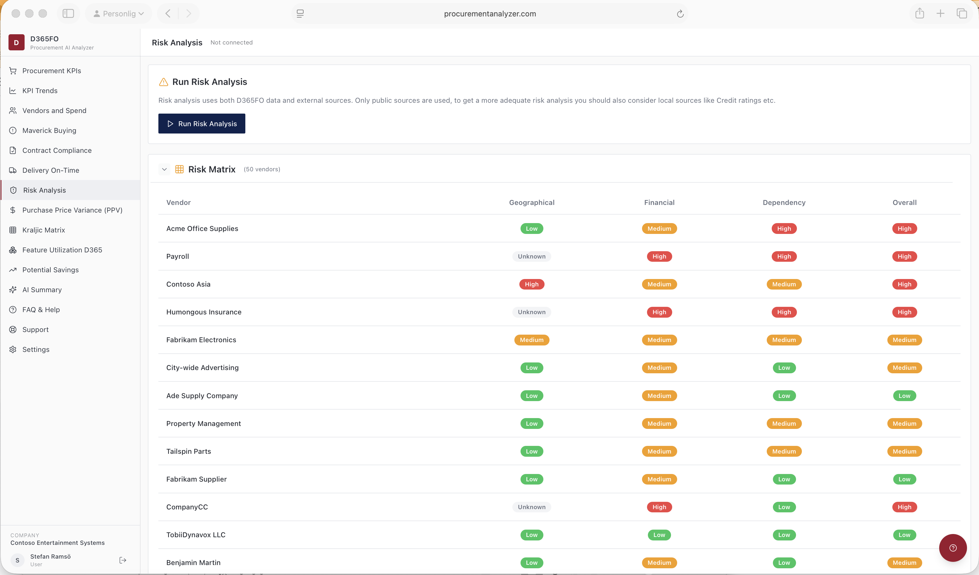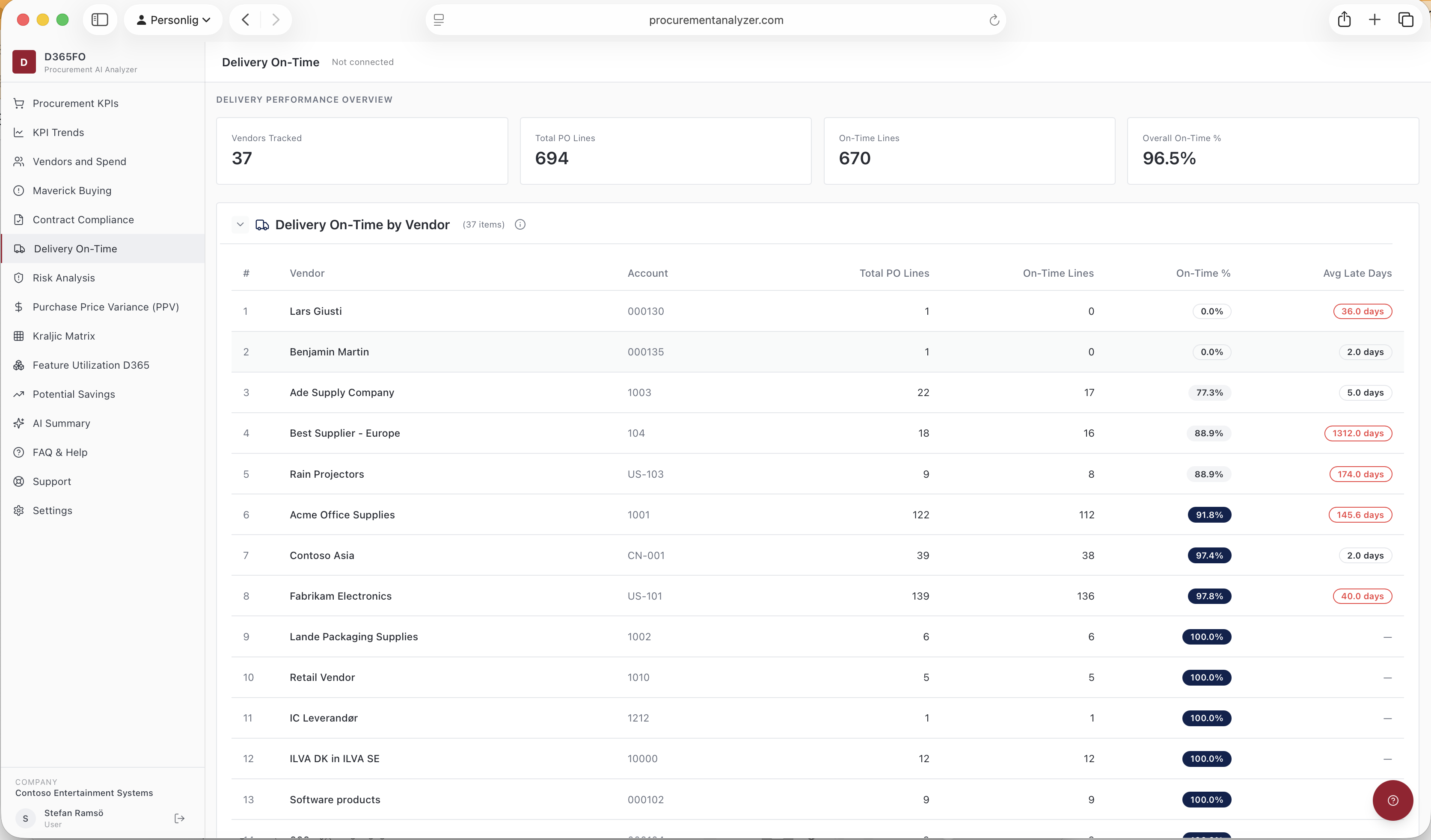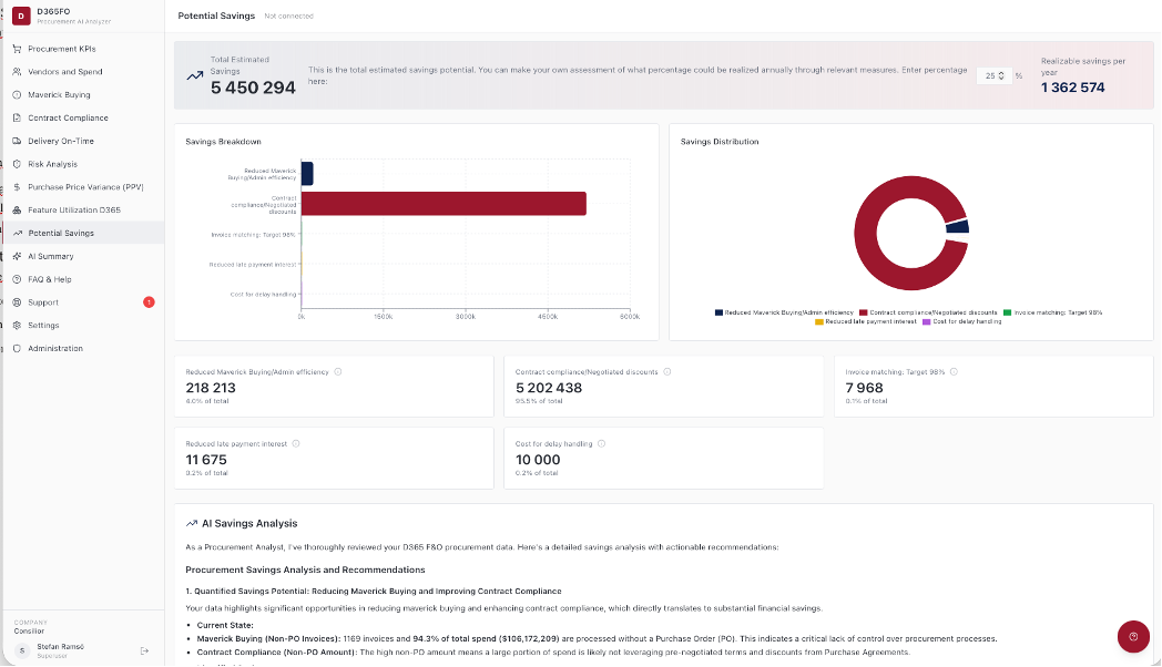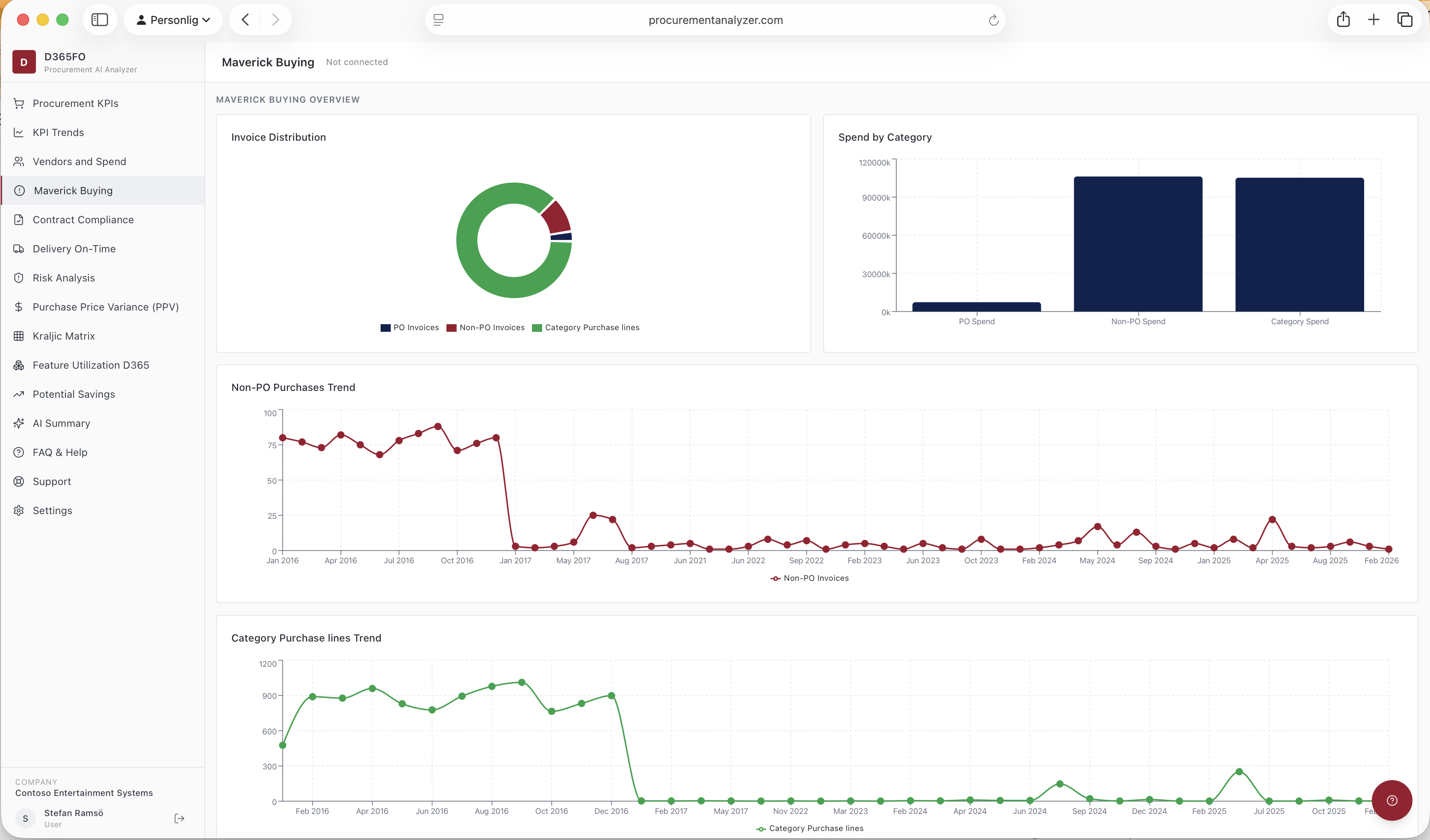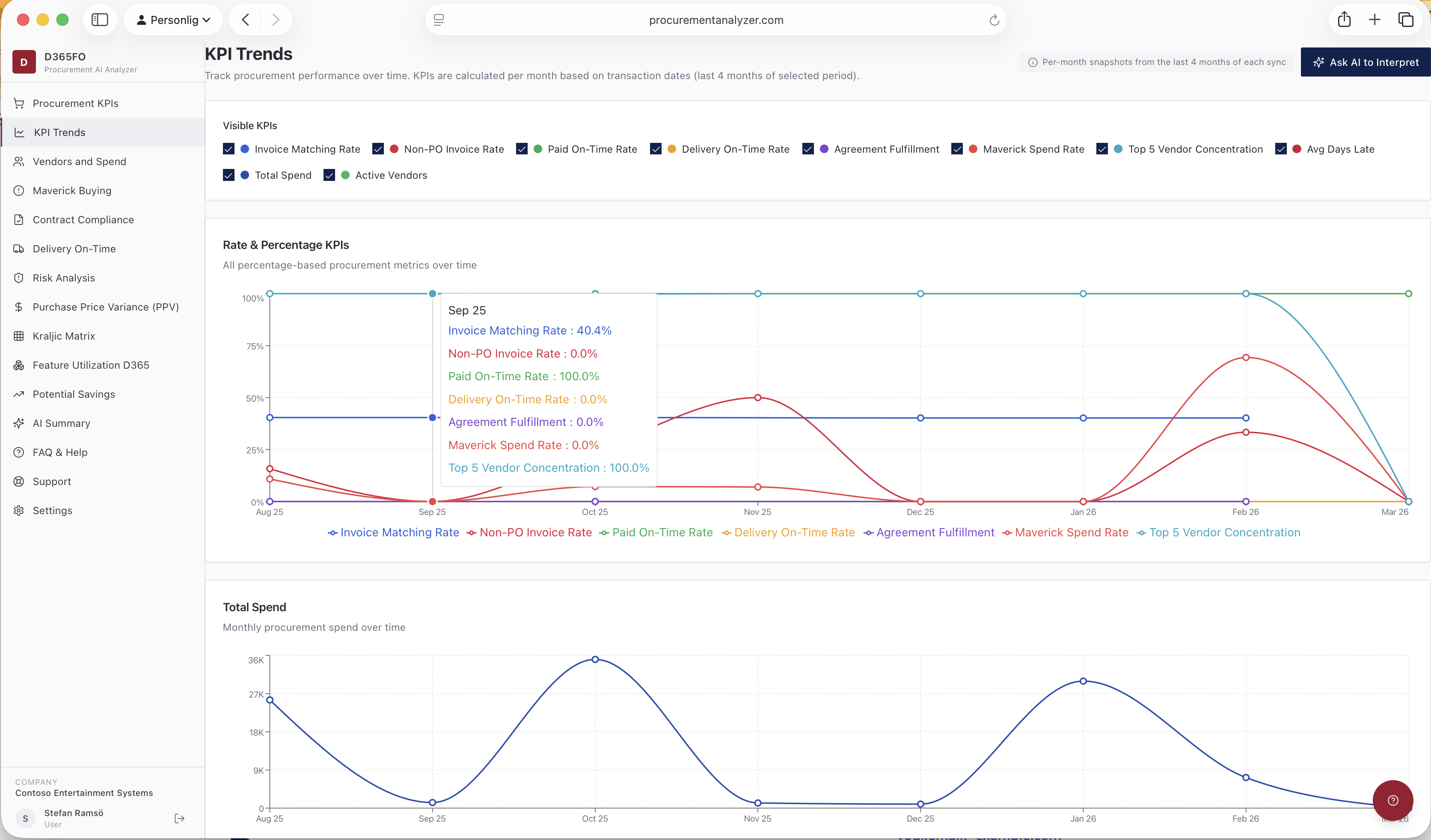 KPIs page gives an overview of number of invoices and how they are divided over PO related non-PO related and Category purchases. Gives overview of Invoice matching rate, invoices paid on-time, Average date late etc. There is also a separat page to follow progress of KPIs over time.